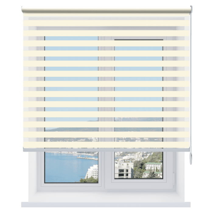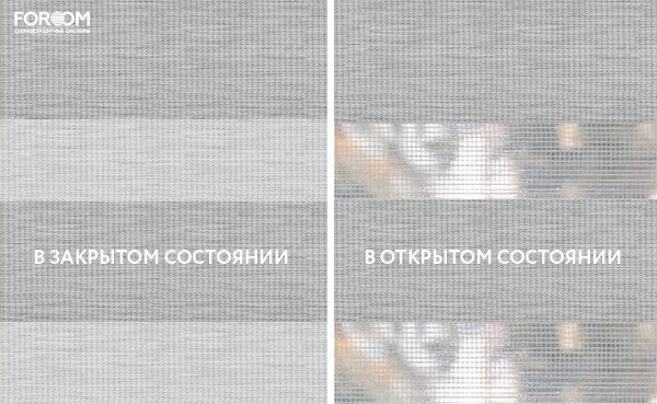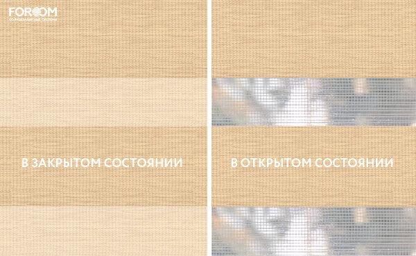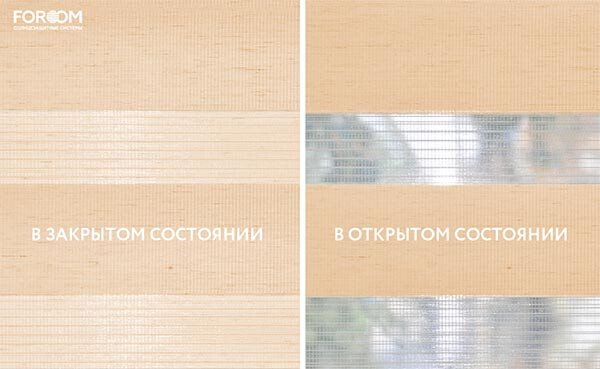 Каждый слой ткани имеет чередующиеся непрозрачные и прозрачные полосы. При смещении полос друг относительно друга можно добиться полного затемнения («ночь», когда непрозрачные полосы совпадают), максимального светопропускания («день», когда совпадают прозрачные полосы) или промежуточных режимов, создавая эффект «зебра».